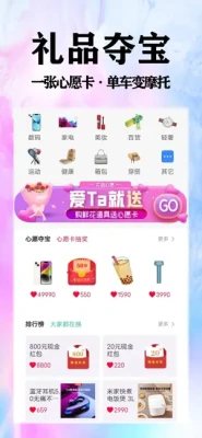 【心愿卡夺宝】小心愿独特的真实礼物交友场景,提供了上万份真实礼品,涵盖手机、数码、家电、健康、运动、百货等各个领域,在小心愿上参与交友夺宝活动即可获得这些精美好礼,让你能够轻松实现自己的购物欲望!你也可以邀请陌生朋友来帮自己获得更多礼品。聊天交友,互赠礼品,附近约会,礼多情意浓,这正是最受广泛年轻人喜爱并积极分享的。