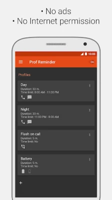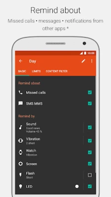 ★ Remind by: sound, vibration, turning screen on, camera flash (not all devices are supported), LED indicator.